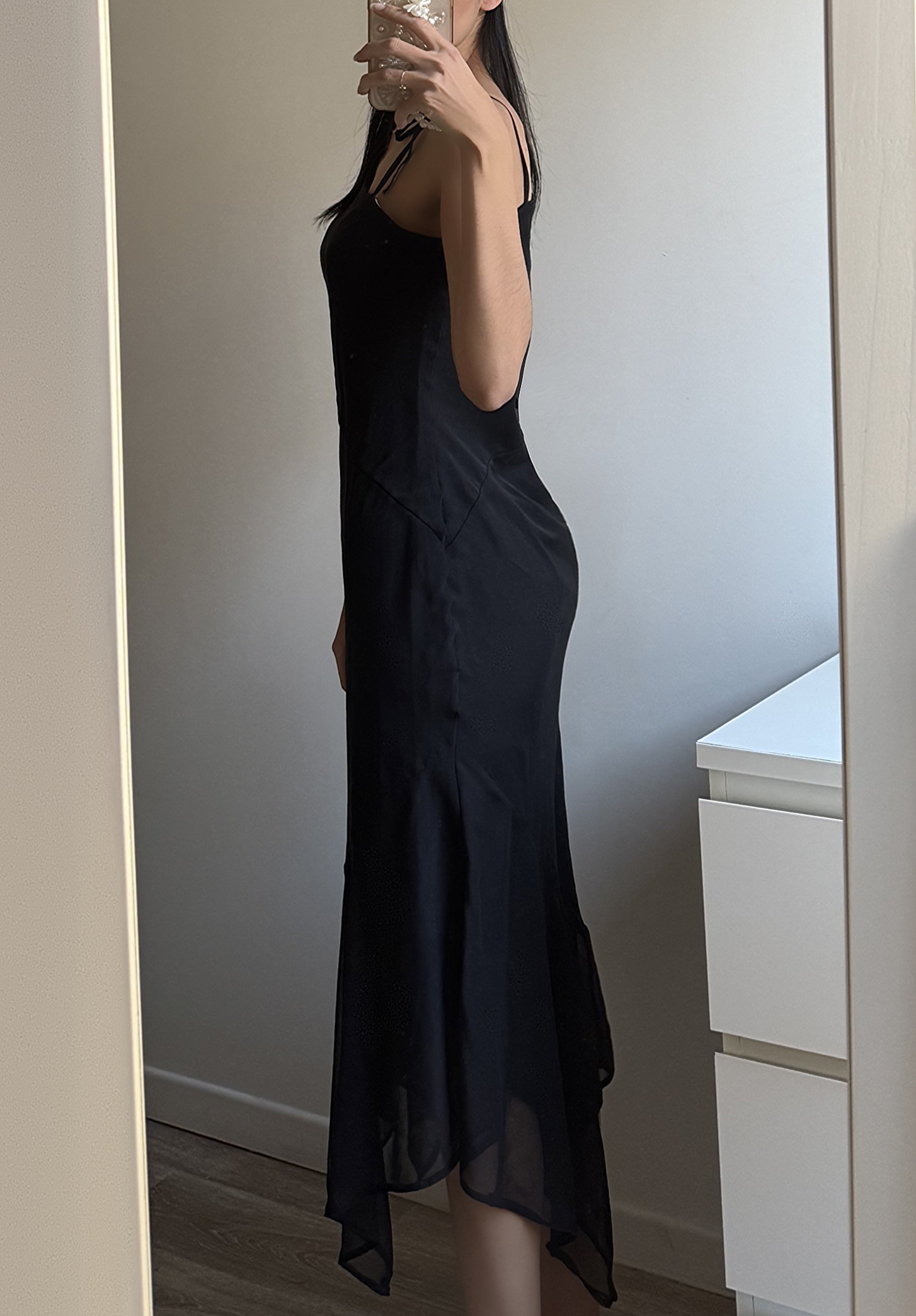 • Robe de soirée longue à volants détail manches volanté et à noeud moulante asymétrique couleur noir
